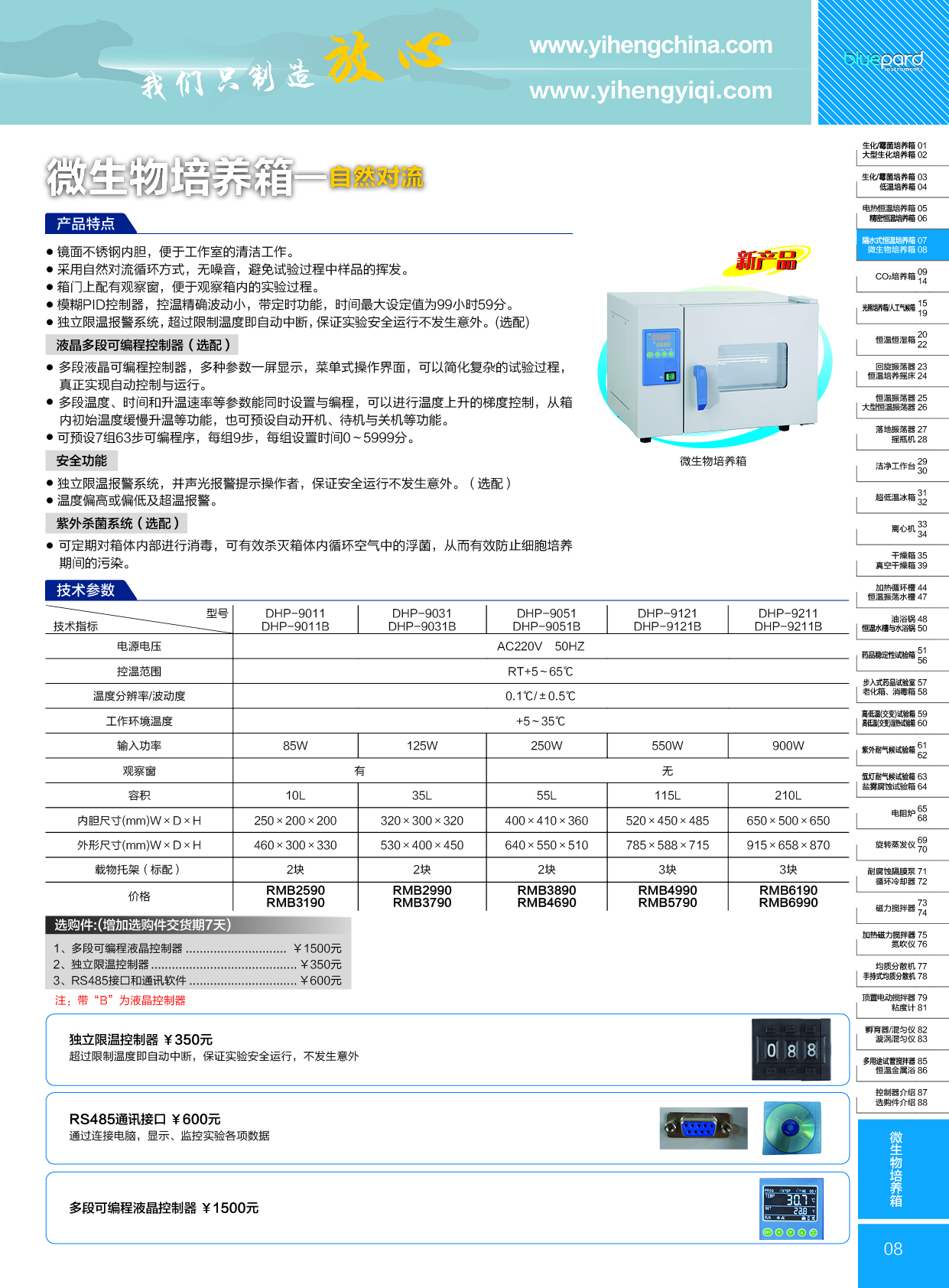 容積207L,控溫范圍室溫+5℃-200℃,溫度波動度±0.2℃;超溫聲光報警并自動切斷加熱電源;采用微電腦智能P.I.D.控制器;內(nèi)置隔板可自動調(diào)節(jié);擱板支架可自由裝卸
