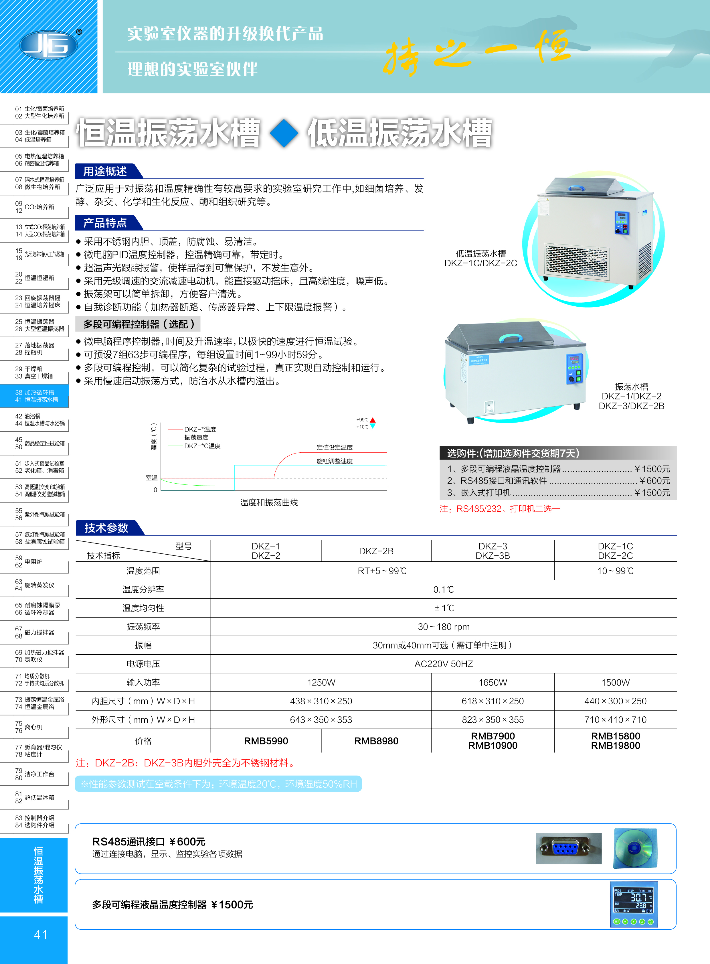 液晶多段可編程控制器(選配)※?多段液晶可編程控制器,多種參數一屏顯示,菜單式操作界面,可以簡化復雜的試驗過程,真正實現自動控制與運行。※多段溫度、時間和升溫速率等參數能同時設置與編程,可以進行溫度上升的梯度控制,從箱內初始溫度緩慢升溫等功能,也可預設自動開機、待機與關機等功能。※可預設7組63步可編程序,每組9步,每組設置時間0~5999分。安全功能※獨立限溫報警系統,并聲光報警提示操...